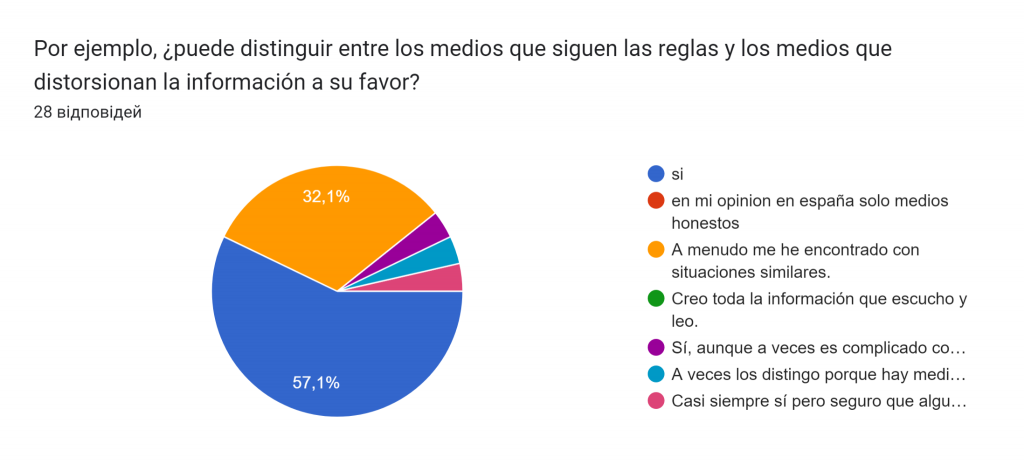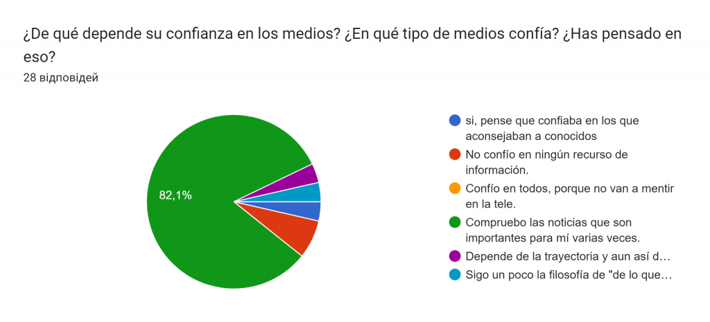 A la pregunta «¿En qué medios confía y de qué depende la confianza en los medios?» – 23 encuestados o el 82,1% respondieron que consultan varias veces las noticias que son importantes para ellos.