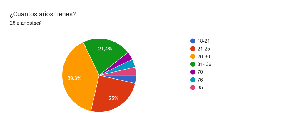 El rango de edad de los encuestados es de 21 a 36 años, un encuestado está en la categoría de edad de 18 a 21 años, 3 personas tienen entre 65 y 70 años.