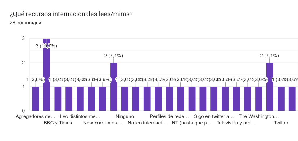 El usuario más popular entre los encuestados es la British Broadcasting Corporation o BBC. Este medio fue señalado por el 10,7% de los encuestados. El 7,1% no lee recursos de información internacionales.