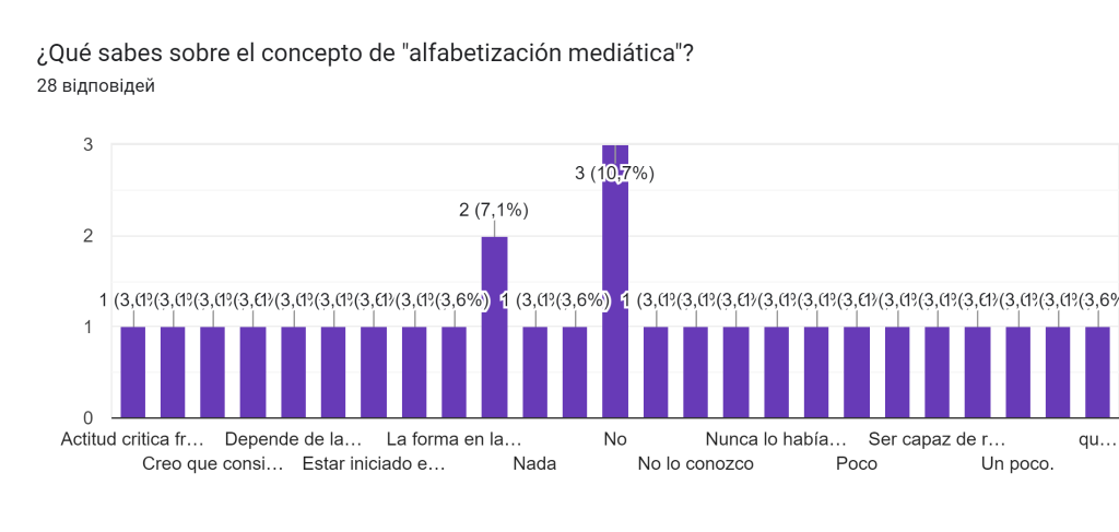 Y a una pregunta tan interesante e importante para mí: «¿Qué sabes sobre el concepto de «alfabetización mediática»?» – 13 de 28 encuestados no han escuchado este término, 2 encuestados saben un poco sobre este término.