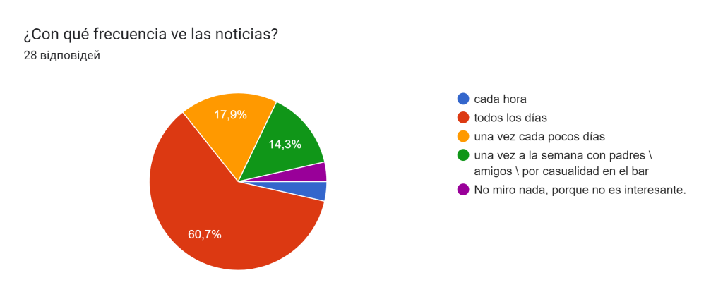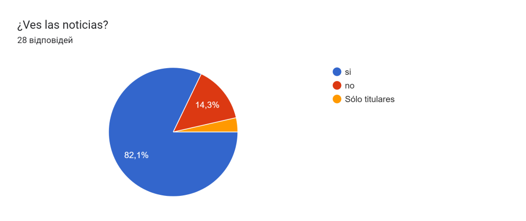 Según el cuestionario, el 82,1% de los encuestados ve las noticias. El 14,3% no ve noticias y el 3,6% solo lee titulares de noticias.