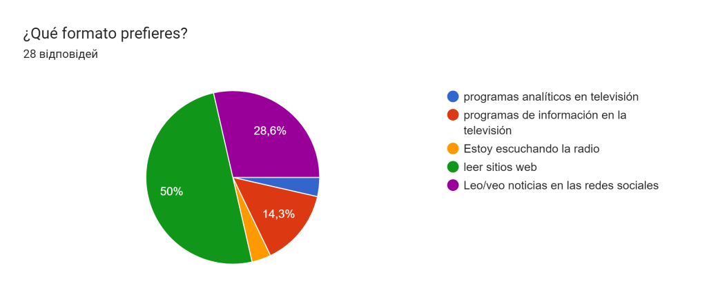 Según esta encuesta, 14 personas leen sitios de noticias, 8 personas leen o ven noticias en las redes sociales. 4 encuestados ven programas informativos en la televisión. Un encuestado escucha la radio y otro ve programas analíticos en la televisión.