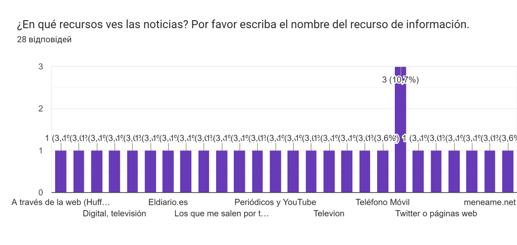 A la pregunta: «¿En qué recursos ve las noticias?» ¿Por favor comparta el nombre de este recurso?” La mayoría de los encuestados nombró a Twitter como el principal recurso de información. Otros encuestados mencionaron opciones de respuesta como:
